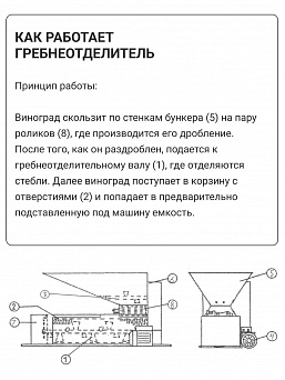 Виноград скользит по стенкам бункера (5) на пару роликов (8), где производится его дробление. После того, как он раздроблен, подается к гребнеотделительному валу (1), где отделяются стебли. Далее виноград поступает в корзину с отверстиями (2) и попадает в предварительно подставленную под машину емкость.